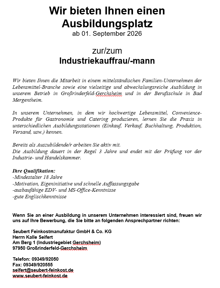 Bitte senden aussagekräftige Bewerbungsunterlagen per Mail an: marcus.seubert@seubert-feinkost.de
